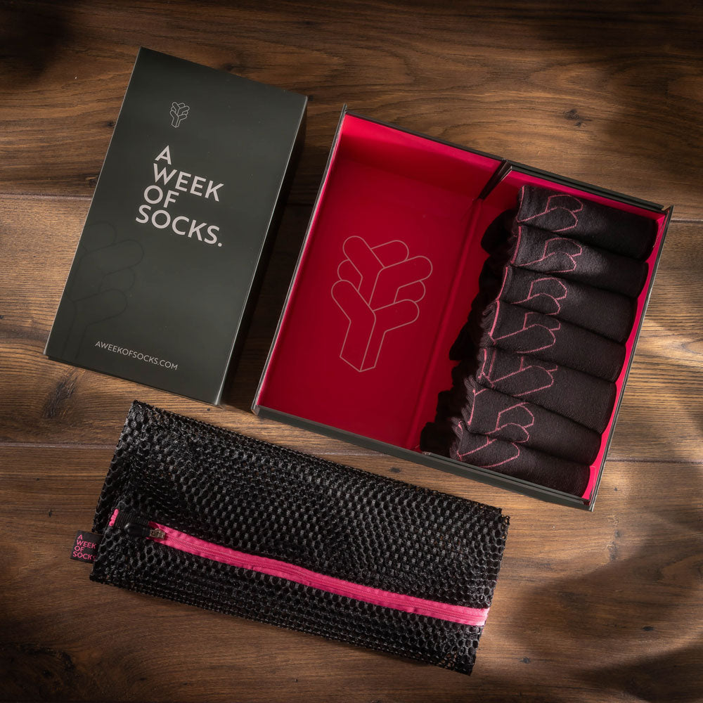 What sets us apart is our unerring commitment to quality, comfort and durability, our beautiful and unique expanding Socks Box and our handy travel/laundry bag - all part of the A Week Of Socks package.